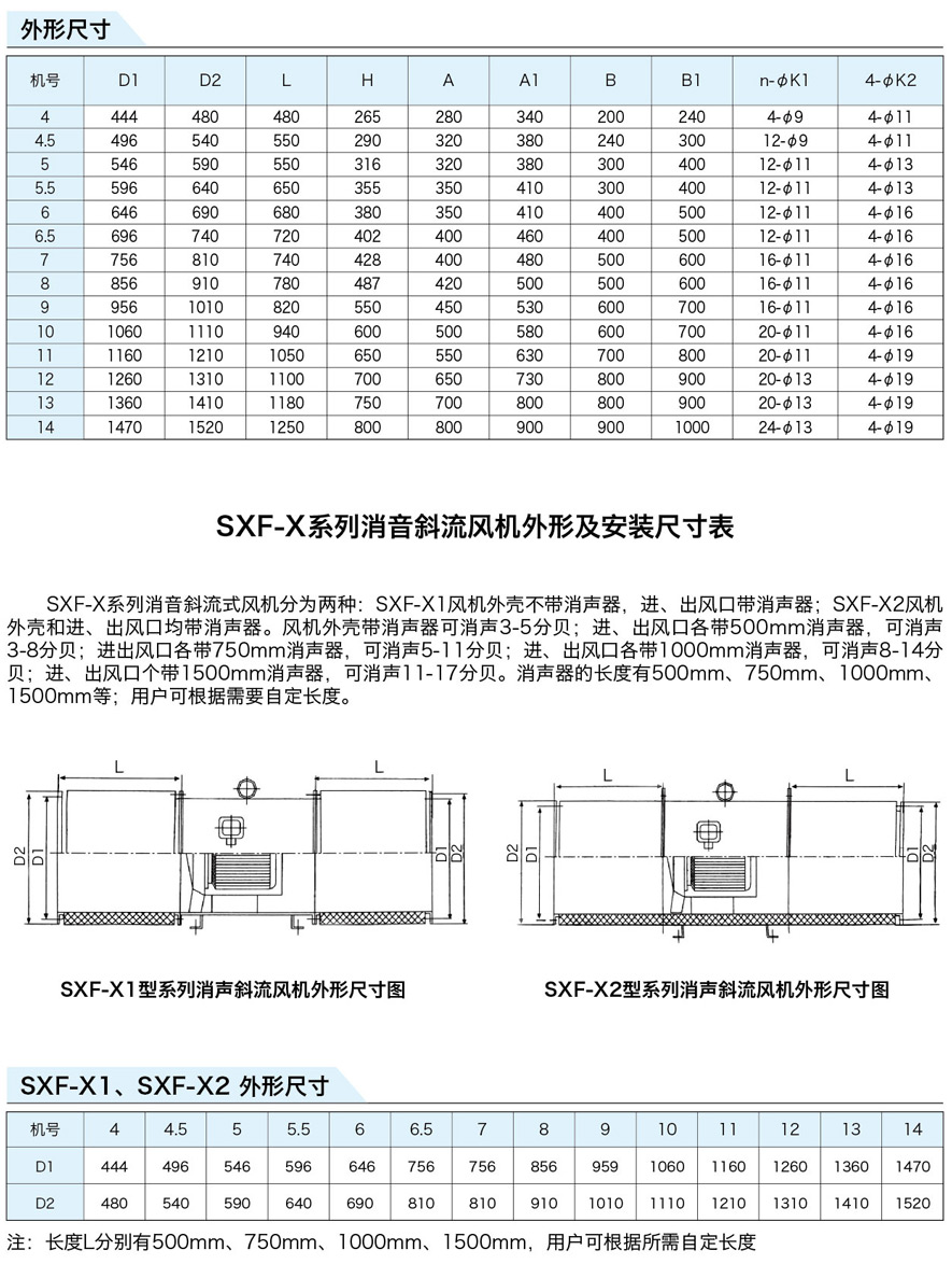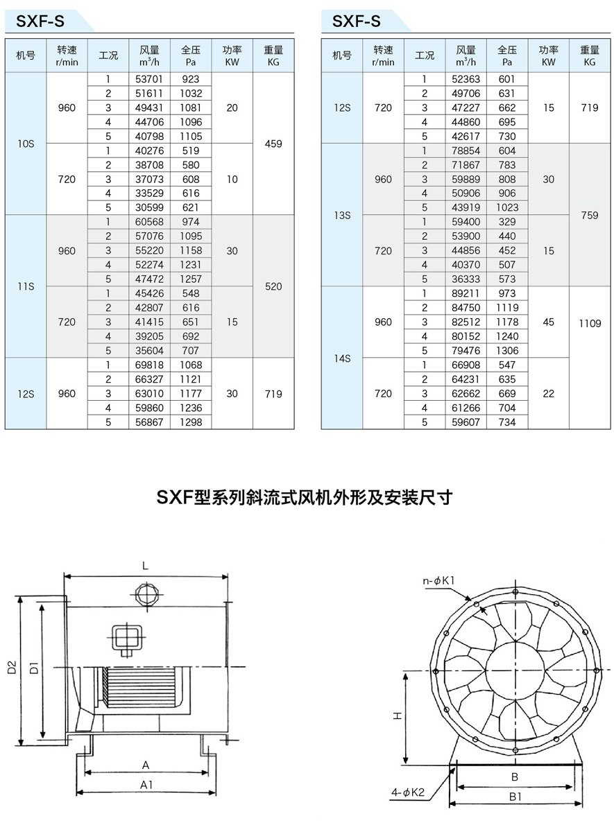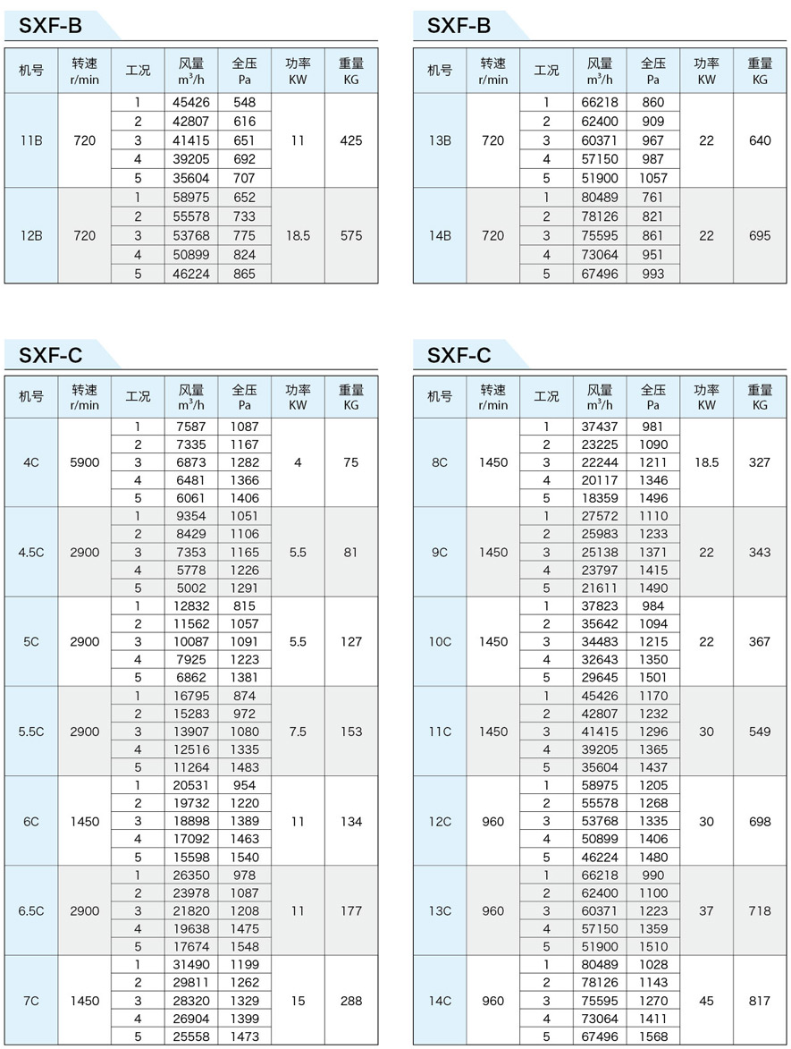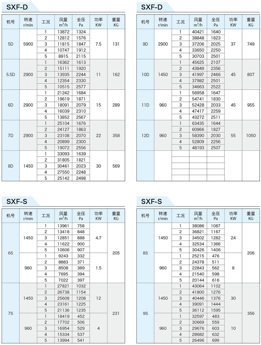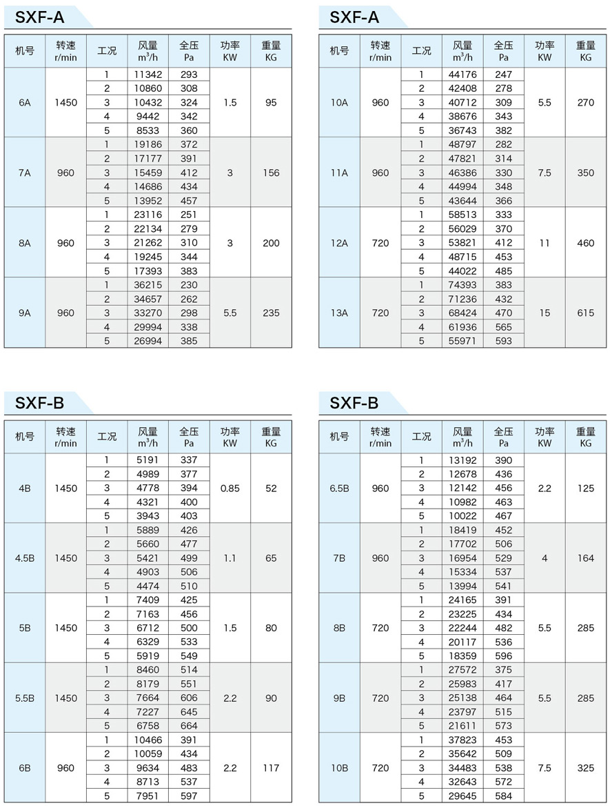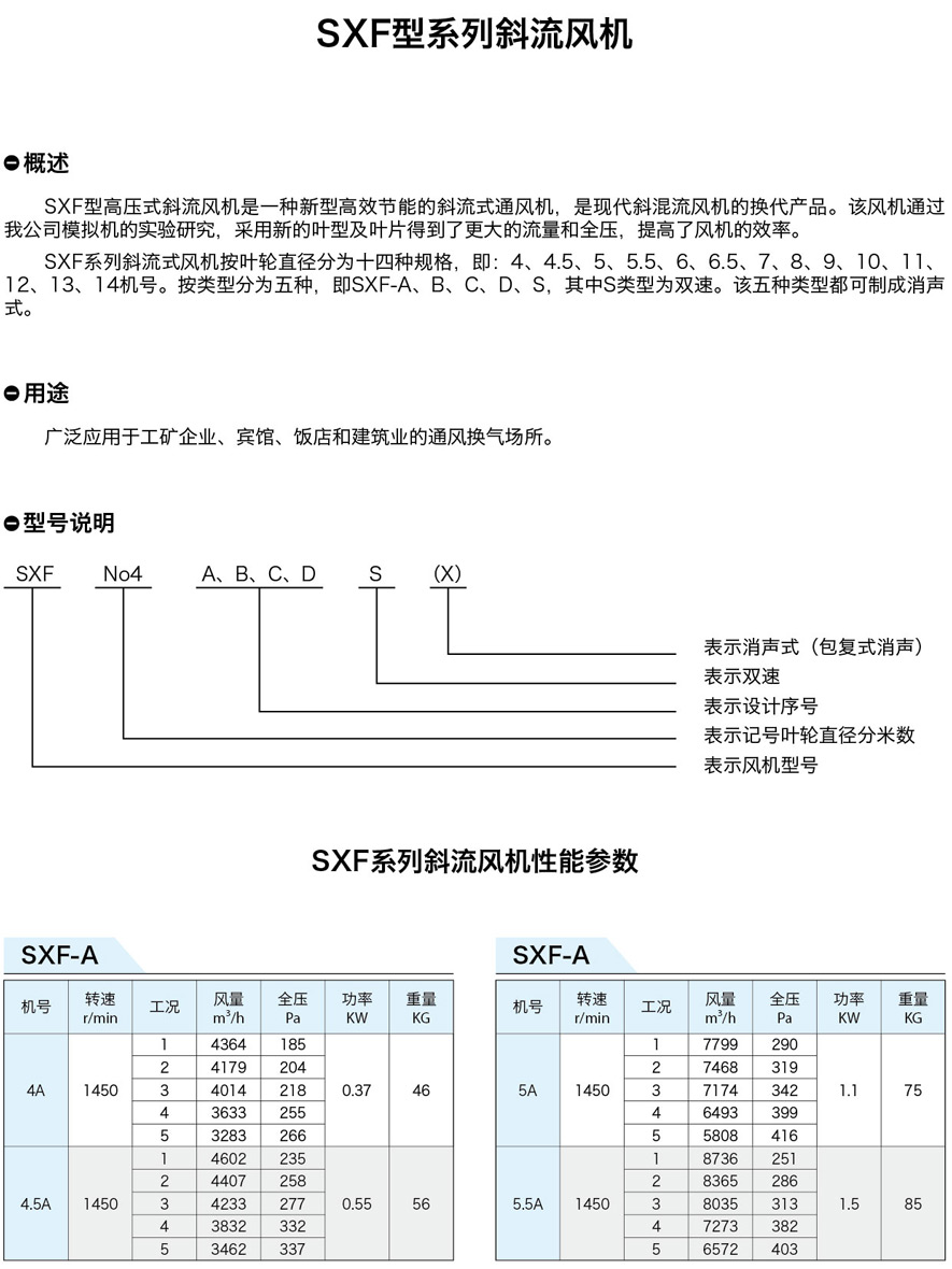 SXF系列斜流式風(fēng)機(jī)按葉輪直徑分為十四種規(guī)格,即:4、4.5、5、5.5、6、6.5、7、8、9、10、11、12、13、14機(jī)號。按類型分為五種,即SXF-A、B、C、D、S,其中S類型為雙速。該五種類型都可制成消聲